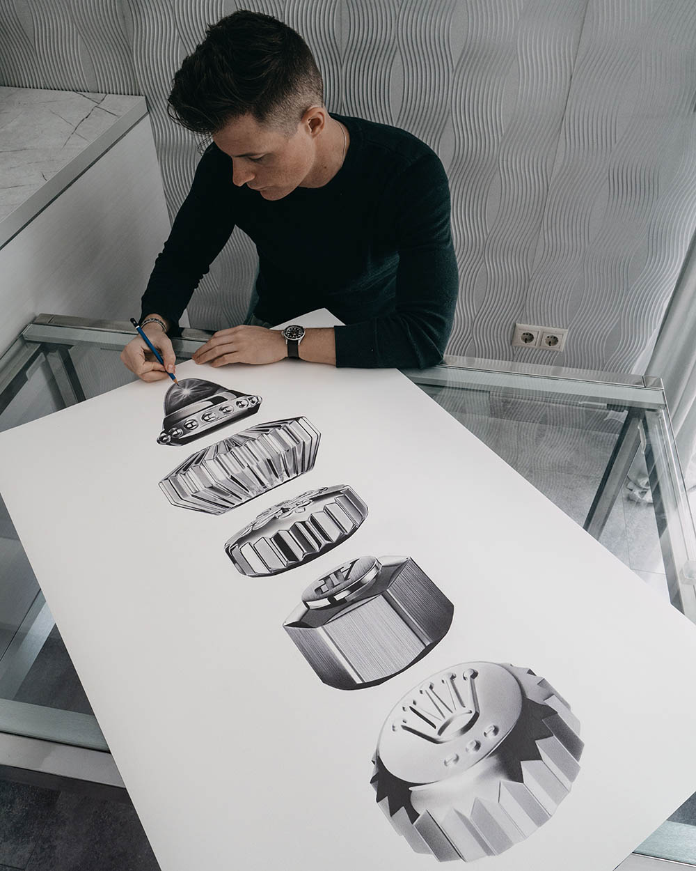 "In this drawing, I have endeavored to gather my favorite crown designs. I have always found this element of the watch particularly captivating, as it is the component with which we engage directly when setting the time or winding the mechanism. These crown shapes serve as defining characteristics of each model."