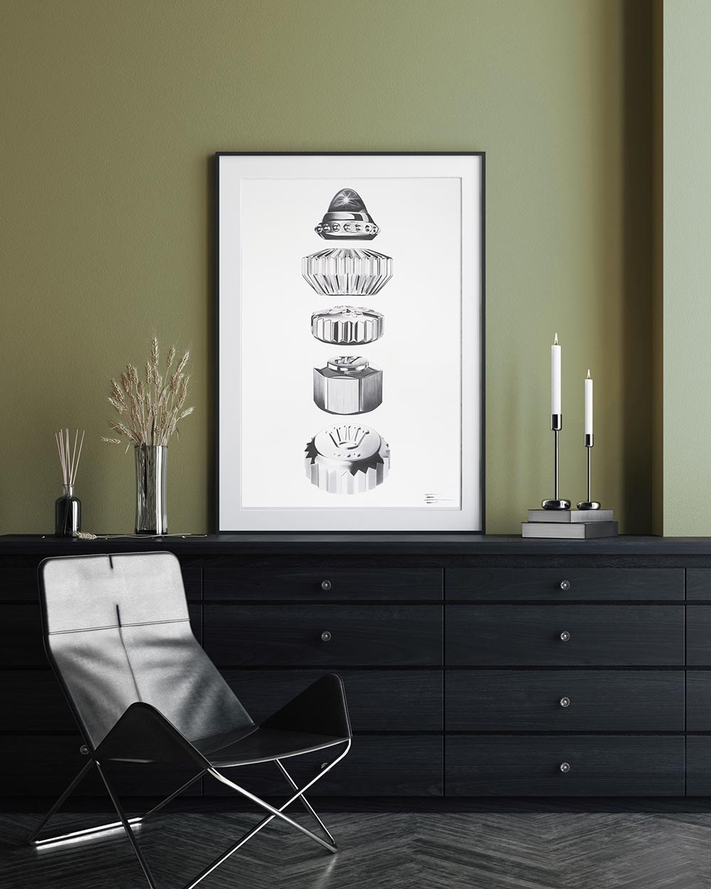 "In this drawing, I have endeavored to gather my favorite crown designs. I have always found this element of the watch particularly captivating, as it is the component with which we engage directly when setting the time or winding the mechanism. These crown shapes serve as defining characteristics of each model."